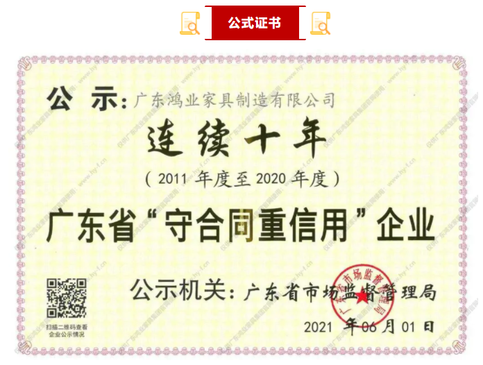 誠信立企|鴻業家具連續十年獲評“廣東省守合同重信用企業”榮譽稱號!